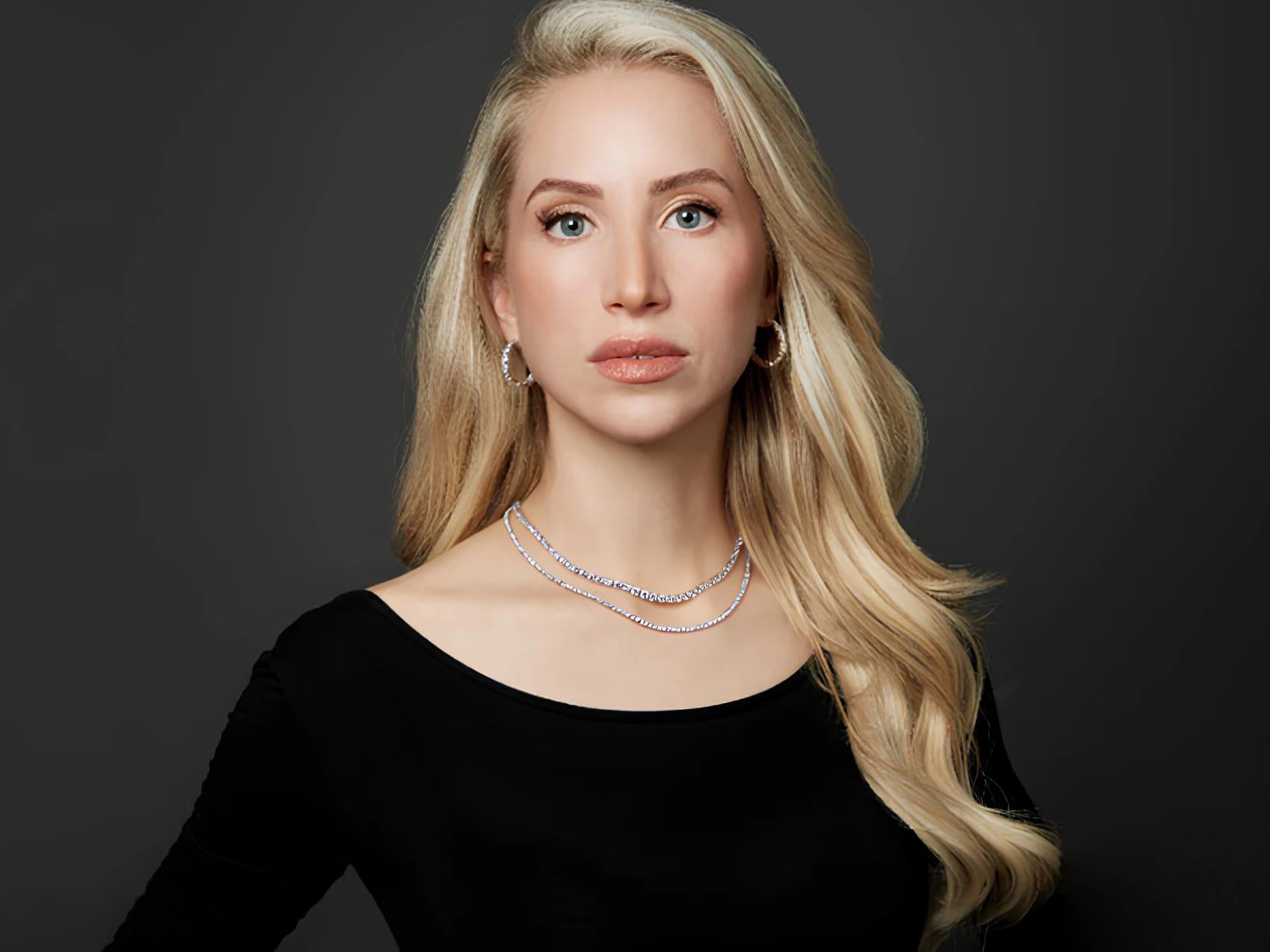 Is seen in PaperCity magazine wearing the Diamond Tennis Necklace in White Gold, the Diamond Tennis Necklace and the Oval Cut Diamond Hoop Earrings. Shop her other favorites from Valobra Master Jewelers.