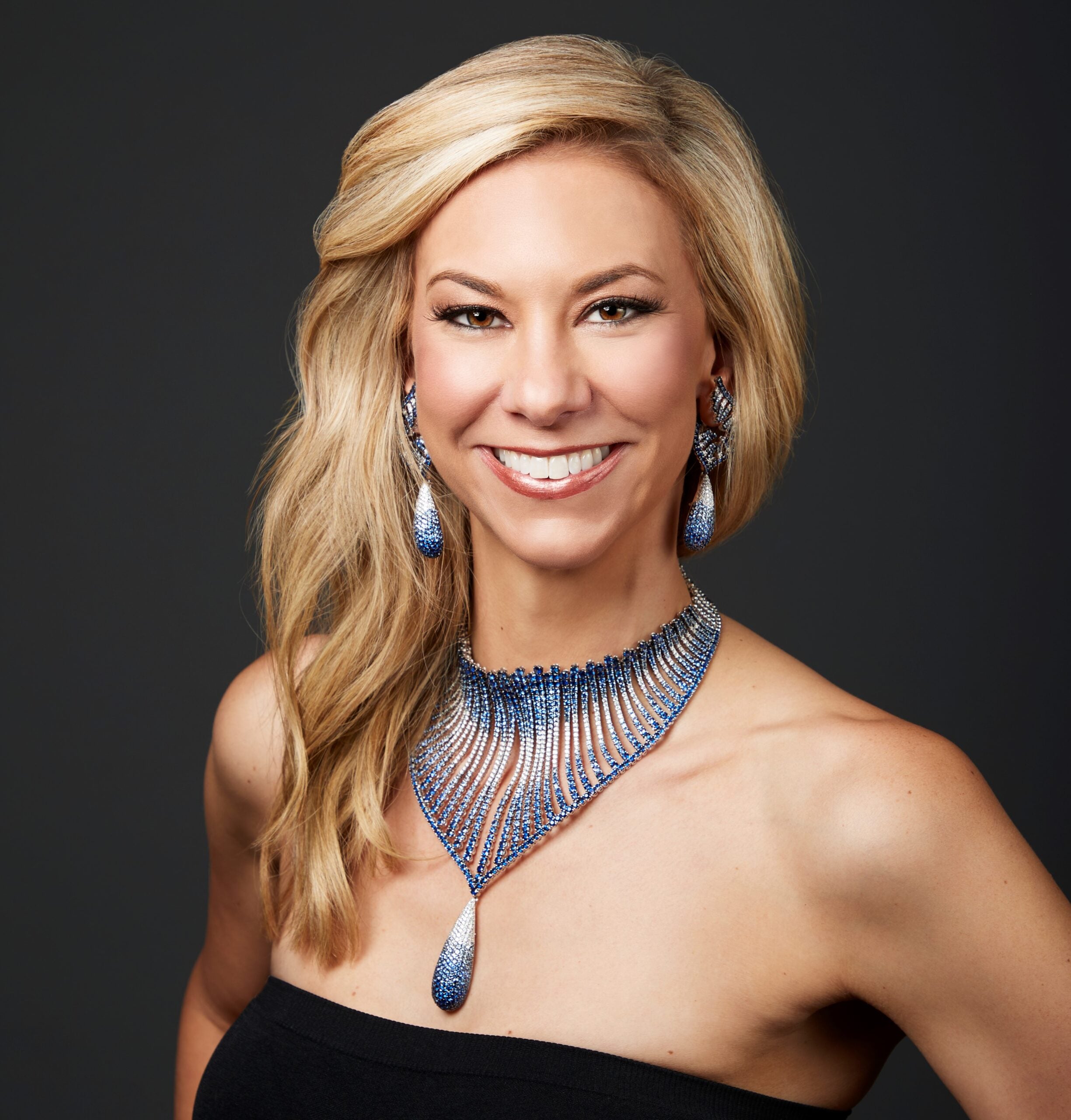 is seen in PaperCity magazine wearing the Ombre Sapphire and Diamond Collar Necklace and the Ombre Sapphire and Diamond Earrings. Shop her other favorites from Valobra Master Jewelers.