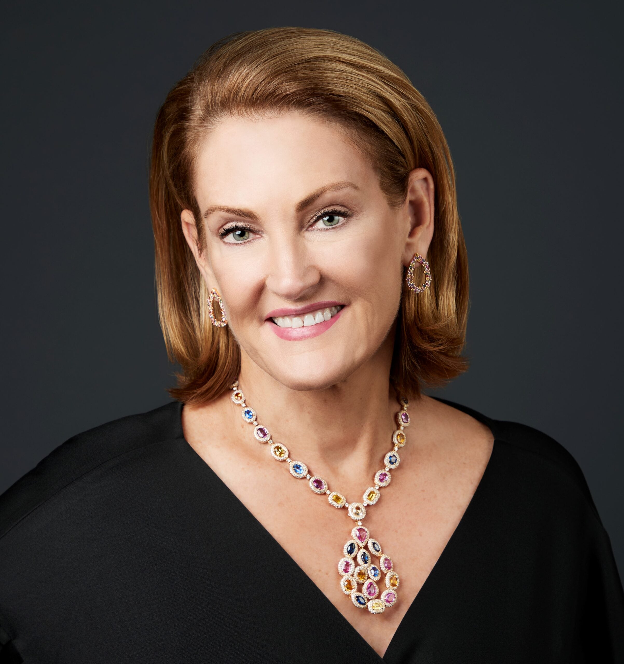 is seen in PaperCity magazine wearing the Colored Sapphire and Diamond Drop Necklace and the Tear Drop Colored Sapphire Earrings. Shop her other favorites from Valobra Master Jewelers.